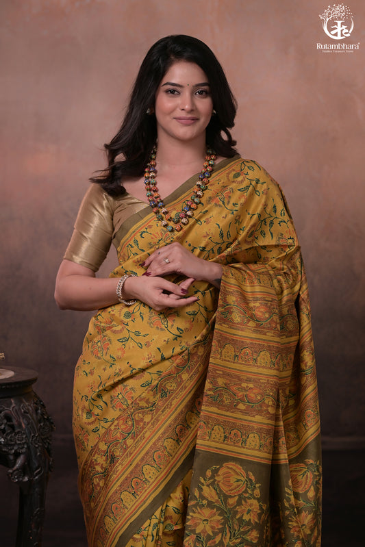 Ushraa - Yellow And Olive Handcrafted Ajrakh Saree In Pure Silk