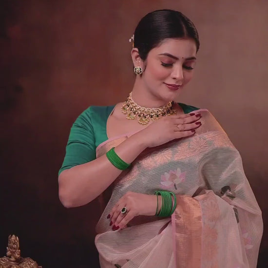 A luminous floral design in zari gently blooms across the plain zari border of this exquisite saree, delicately interspersed with elegant lotus butas woven in coloured thread and zari that catch the light with every movement. The border features a subtle gold zari border, beautifully accented with a pastel pink selvedge that adds just the right touch of contrast. The pallu is a statement in quiet luxury—intricately woven with gold zari diagonal geometric plain pallu.. Paired with a separate Pastel Pink blouse adorned with zari buttas and matching zari borders, this ensemble is a perfect blend of grace, tradition, and refined modernity.