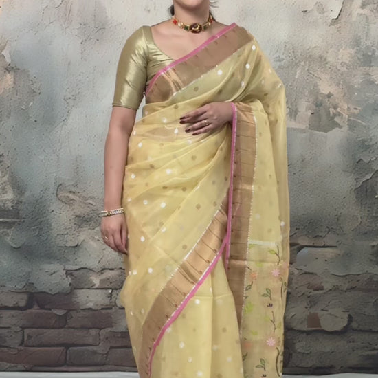 A luminous gold and silver zari coin buta gently blooms across the body of this exquisite saree. The border features a subtle gold zari muniya border, beautifully accented with a light pink and silver selvedge that adds just the right touch of contrast. The pallu is a statement in quiet luxury—intricately woven with a gold zari background and complemented by a graceful floral bouquet woven in coloured threads. Paired with a separate orange blouse adorned with gold zari buttas and matching zari borders, this ensemble is a perfect blend of grace, tradition, and refined modernity.