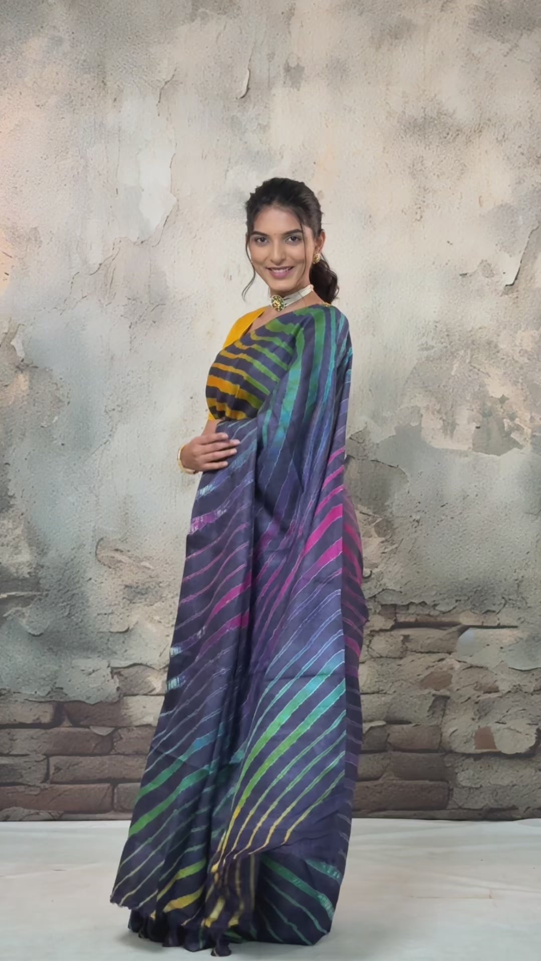 Leheriya textile is one of India's distinctive tie and dye crafts, primarily found in Rajasthan. Drawing inspiration from the desert landscape, the artisans deploy resist dyeing technique to create diagonal, chevron or chatai (Mothera) striped patterns in bright colors, which stand out against the arid desert backdrop.