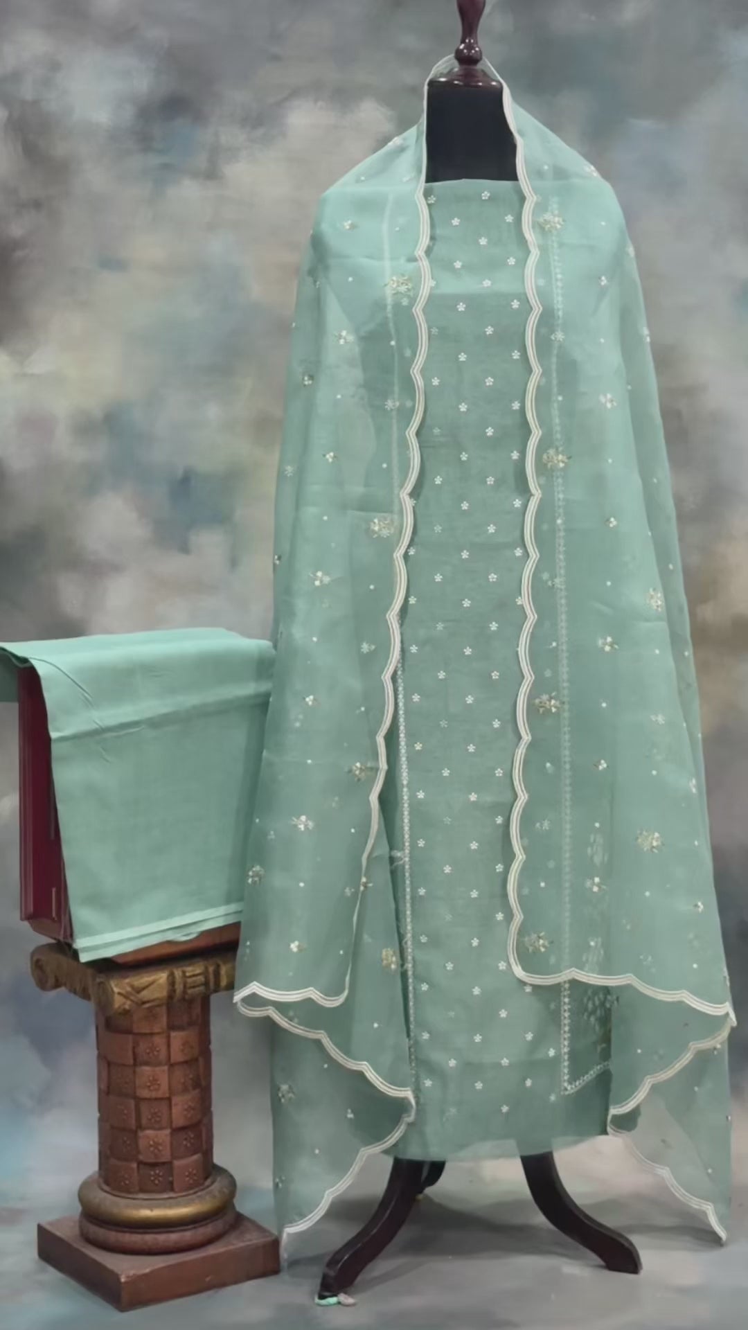 Effortlessly elegant, this aqua green Chanderi suit set is a breath of fresh air. The kurta features fine floral chanderi embroidery in white and gold thread, giving it a serene and refined aesthetic. Accentuated with minimal yet detailed patterns, the look is soft, graceful, and ideal for both festive and semi-formal occasions.