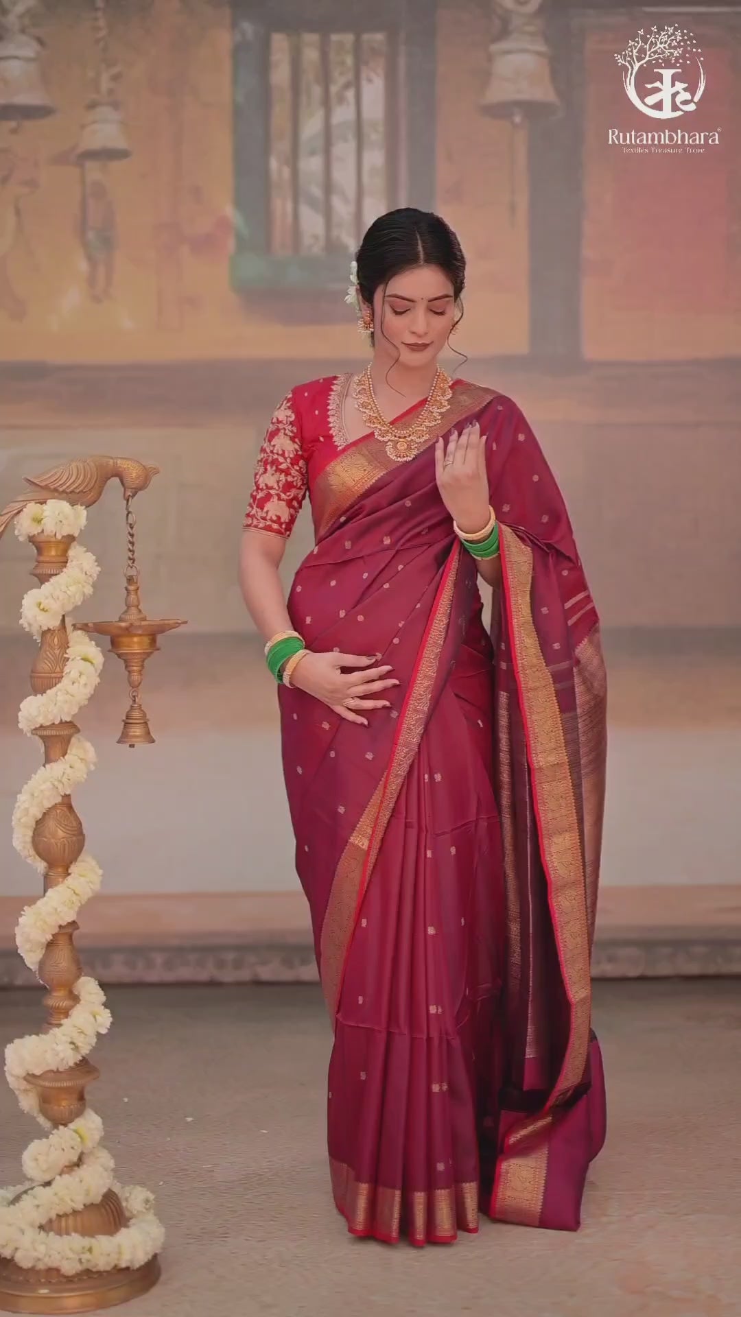 Eevara Burgundy Maroon Kancheevaram Heirloom Silk Saree with medium pure zari border A beautiful and authentic Kanjivaram heirloom saree with small annapakshi woven borders on both sides.These sarees are handwoven with 4 ply and 8 twist pure silk yarn with the traditional kanjivaram weaving techniques.