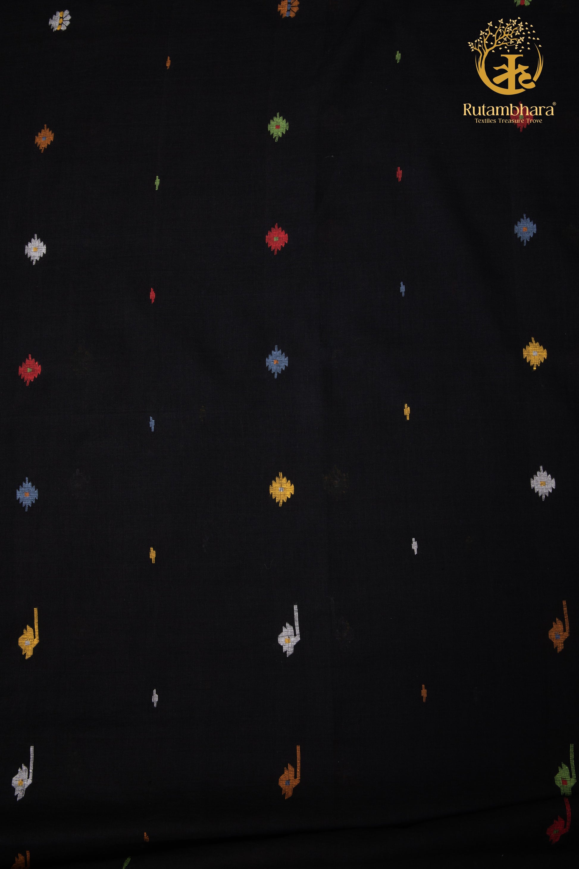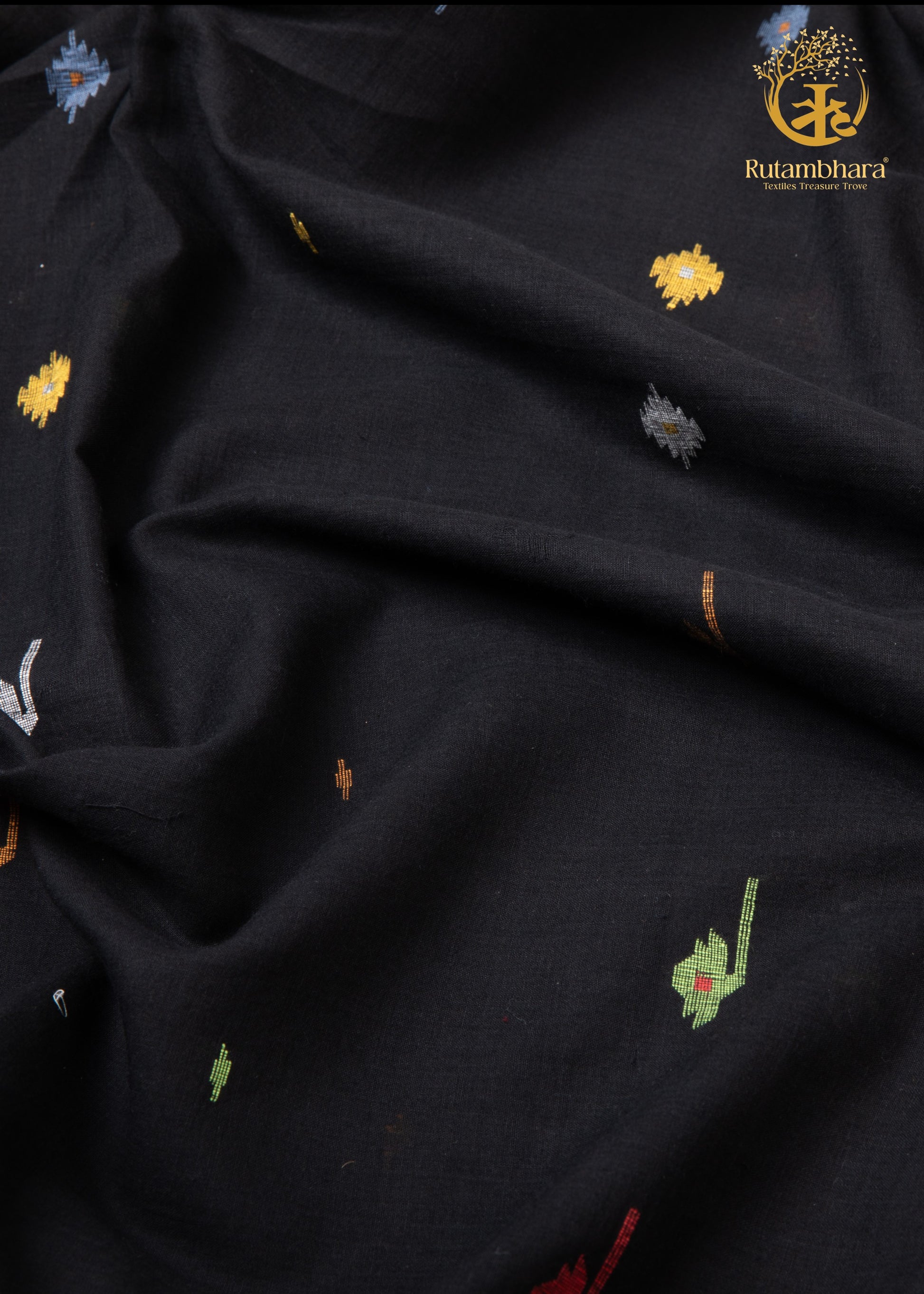 Set on a deep black base, vibrant hand-inlaid Jamdani motifs appear like scattered jewels—each one individually woven into the fabric during the weaving process, never printed or embroidered. This meticulous technique creates a subtle yet captivating visual rhythm, true to authentic Jamdani craftsmanship.