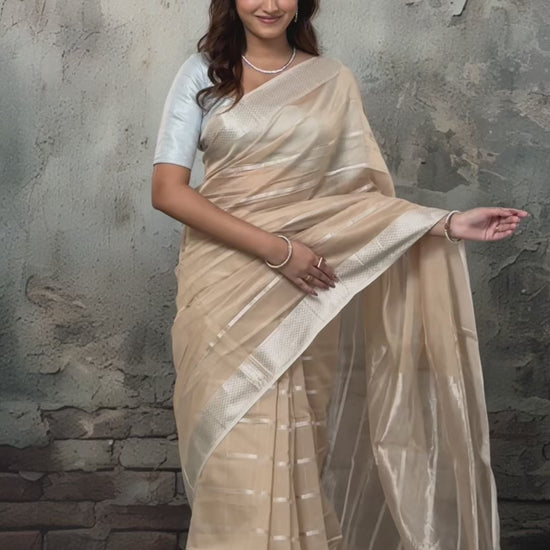 A Maheshwari saree is more than just a garment—it is a woven story, embodying the spirit of the Narmada, Maheshwar Fort, and Rani Ahilyabai’s vision. This saree has been designed in contempory style with horizantal zari stripes run throughout the body with resham zari chatai border. Crafted from a perfect blend of silk’s sheen and cotton’s comfort, it is lightweight, luxurious, and elegant.