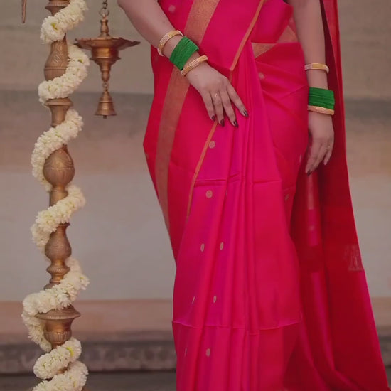 Eevara Pink Kancheevaram Heirloom Silk Saree Most gorgeous shocking pink Mayil Chackaram handwoven authentic kanjivaram with magnificent intricate pallu. These sarees are woven with 4 ply and 6 twist pure silk yarn with the traditional kanjivaram weaving technique of hand shuttle handloom which is rare to find nowadays.