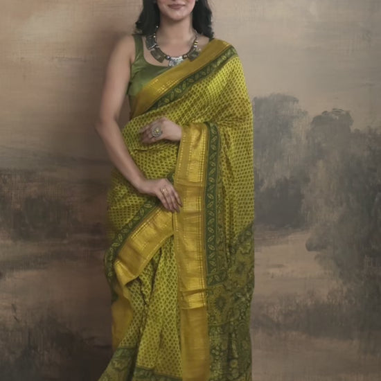Ushraa - Ajrakh Hand Block Printed Yellow and Green Cotton Silk Saree with Gold Zari Border