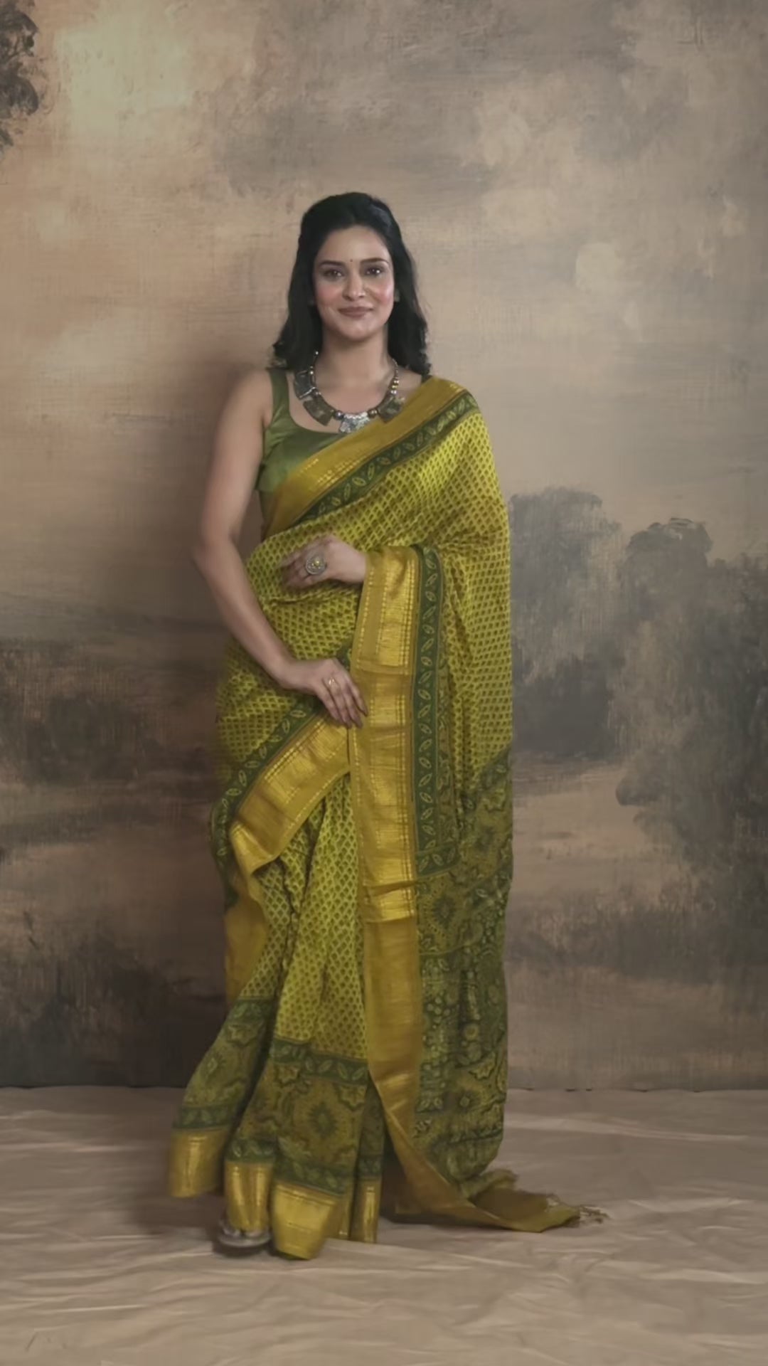 "Golden Harvest" – A Radiant Blend of Tradition & Grace Wrap yourself in the rich warmth of tradition with our "Golden Harvest" handcrafted saree, a celebration of earthy tones and timeless craftsmanship. This saree features a striking mustard yellow base adorned with intricate green paisley and floral motifs, beautifully balanced with a lustrous golden zari border and pallu.