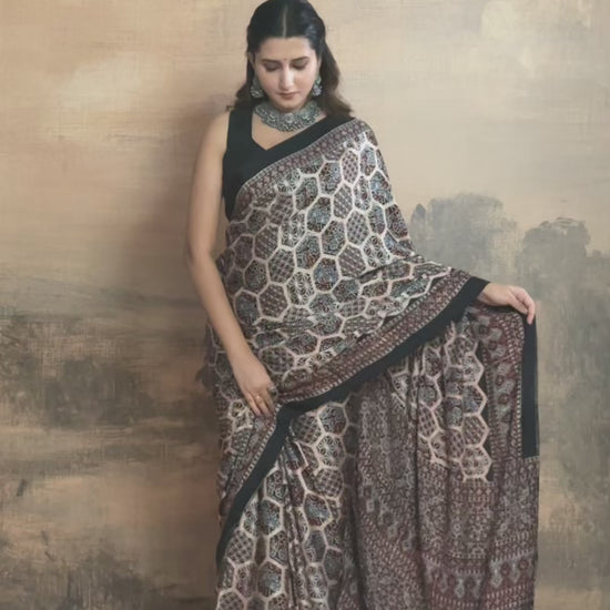 Ajrakh Handcrafted Saree – Geometry of Grace Rooted in centuries of artisanal tradition, this handcrafted Ajrakh saree is a stunning testament to the enduring legacy of Indian textile art. Made on a luxurious modal silk base, it features a captivating interplay of geometric motifs, floral elements, and intricate lattice patterns — all meticulously hand block-printed using traditional Ajrakh techniques. The subtle blush beige backdrop is brought to life with deep tones of indigo, madder red, black, and rust — created from natural dyes through a complex process involving multiple stages of resist dyeing and washing. The repeating hexagonal forms symbolize balance and symmetry, while the densely patterned pallu showcases the depth of craftsmanship that defines true Ajrakh.