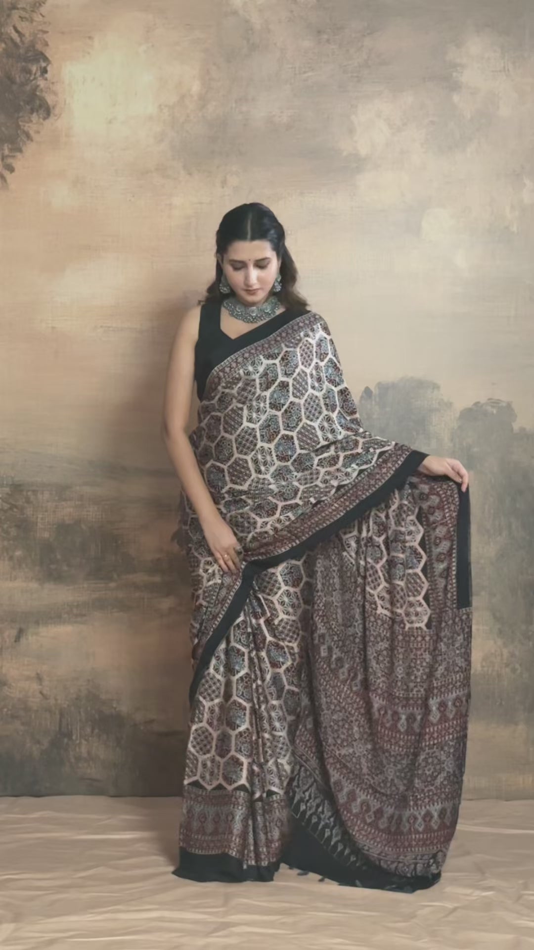 Ajrakh Handcrafted Saree – Geometry of Grace Rooted in centuries of artisanal tradition, this handcrafted Ajrakh saree is a stunning testament to the enduring legacy of Indian textile art. Made on a luxurious modal silk base, it features a captivating interplay of geometric motifs, floral elements, and intricate lattice patterns — all meticulously hand block-printed using traditional Ajrakh techniques. The subtle blush beige backdrop is brought to life with deep tones of indigo, madder red, black, and rust — created from natural dyes through a complex process involving multiple stages of resist dyeing and washing. The repeating hexagonal forms symbolize balance and symmetry, while the densely patterned pallu showcases the depth of craftsmanship that defines true Ajrakh.
