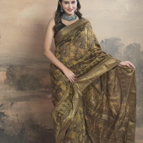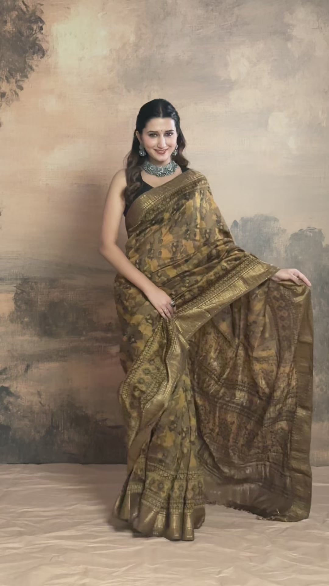Golden Grace. Tribal Echoes. Regal Craft. Step into the warmth of tradition with this handcrafted Ajrakh saree in a rich palette of ochre, burnt sienna, and antique gold. Rooted in heritage and elevated by earthy sophistication, this saree is a stunning tribute to the artisanal excellence of Kutch, Gujarat. Crafted in a lustrous silk-cotton blend, it offers a graceful fall with a natural sheen, making it a luxurious yet breathable choice for day-to-evening wear. The intricate Ajrakh block prints in muted tones whisper stories of age-old artistry and tribal tales, brought to life with natural dyes through a labor-intensive, multi-step process. The golden zari border enhances the saree’s festive charm, making it an ideal pick for weddings, cultural celebrations, or simply when you want to feel regal. Let this saree drape you in timeless tradition and golden elegance, turning every step into a celebration of India's textile legacy
