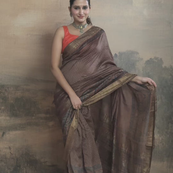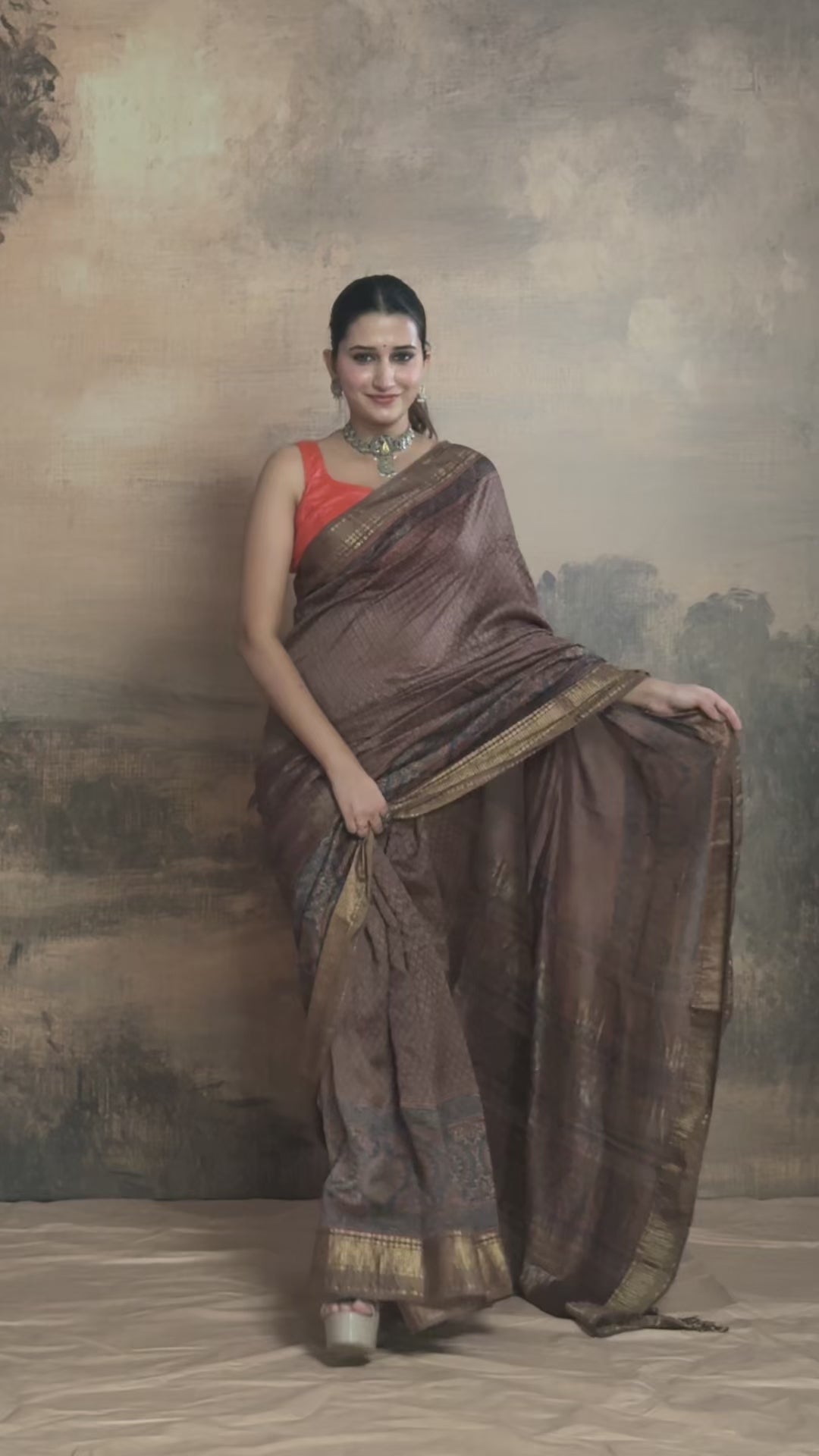 "Rustic Elegance. Artisanal Grace. Woven Poetry." Step into the world of timeless artistry with this handcrafted Ajrakh saree in a rare and regal earthy rust brown. Meticulously woven in a silk-cotton blend, this drape harmonizes texture and tradition—offering a graceful fall, soft sheen, and breezy comfort. The saree is adorned with intricate Ajrakh-inspired block prints, echoing the geometric sophistication and earthy palette characteristic of India’s ancient Indus Valley craft. The contrast of teal blue detailing against the deep rust base adds a rich visual intrigue, while the gold zari border exudes understated luxury. Whether you're attending a cultural soirée or a festive gathering, this saree speaks volumes of heritage and heart. This is slow fashion at its finest—rooted in history, dyed with nature, and woven with intention. An heirloom for the modern connoisseur of culture.