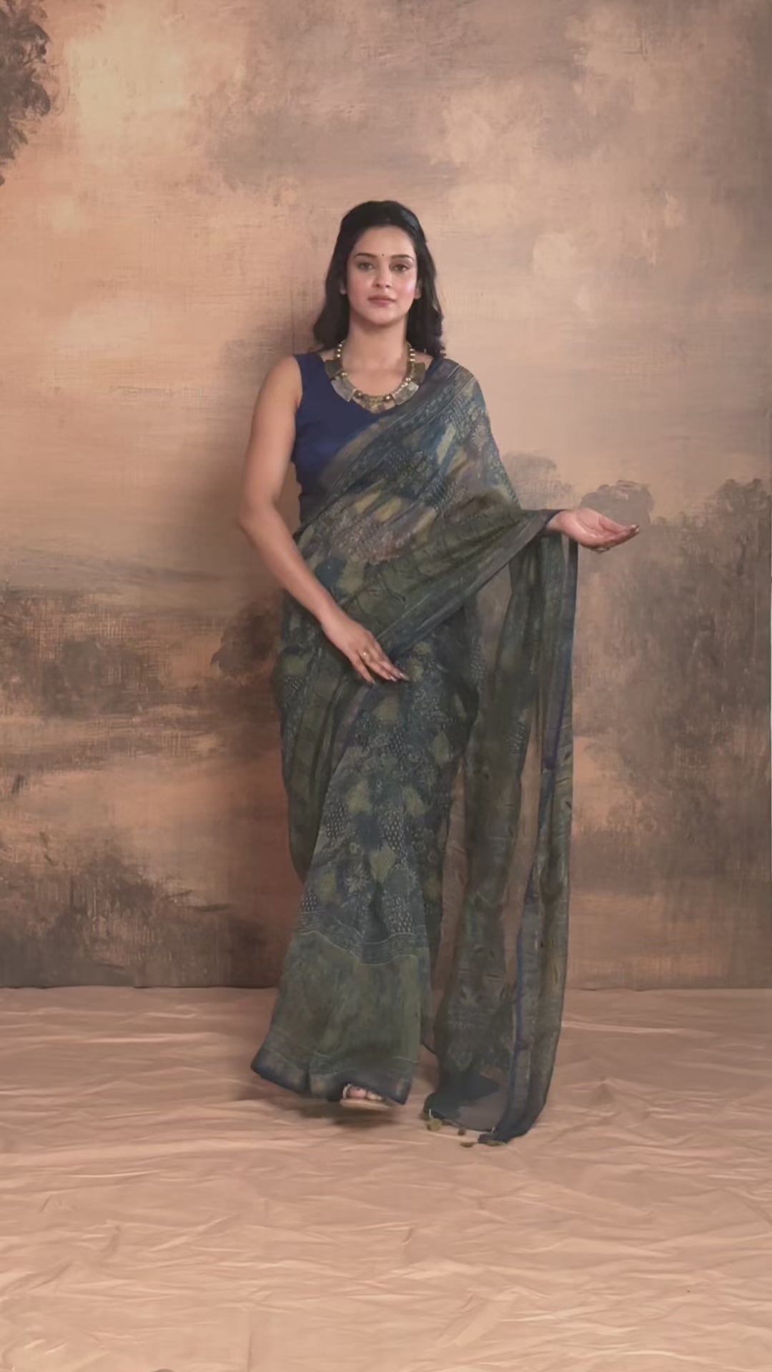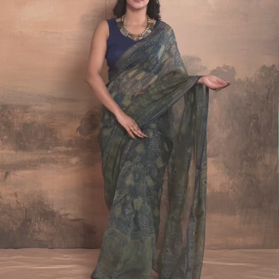 Tana-Bana captures the soul of heritage with the lightness of elegance. Woven in airy missing checks kota type light weight silk cotton, this saree is adorned with intricate Ajrakh-inspired prints in deep indigo, moss green, and muted beige tones. The traditional patterns flow seamlessly across the body, creating a visual rhythm of floral and geometric motifs. Finished with a fine zari border, it adds a hint of festive sparkle without overpowering its earthy grace. Perfect for cultural gatherings, intimate occasions, or as a statement piece in your slow-fashion collection.
