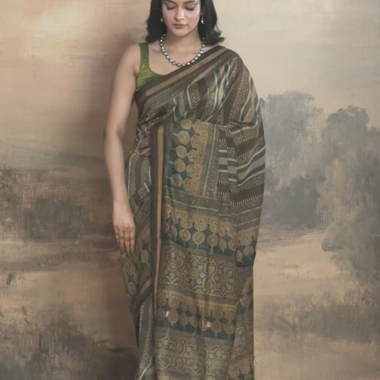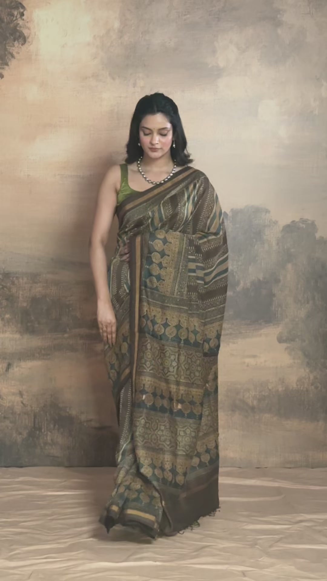 Saree Rooted in tradition, refined for today. Inspired by the richness of the earth and the harmony of ancient architecture, this Ajrakh saree in deep walnut brown, muted indigo, and golden ochre is a timeless expression of handcrafted heritage. The design features meticulous geometric latticework, floral medallions, and symmetrical borders that reflect the soul of desert craft. Handblock printed by master artisans using natural dyes, the saree is crafted on fluid Silk Cotton base — soft, breathable, and radiant. Its richly patterned pallu and vertical stripe layout flatter the silhouette while keeping the look bold yet rooted. This is not just a saree — it is an imprint of the land, a story told in earthy tones.